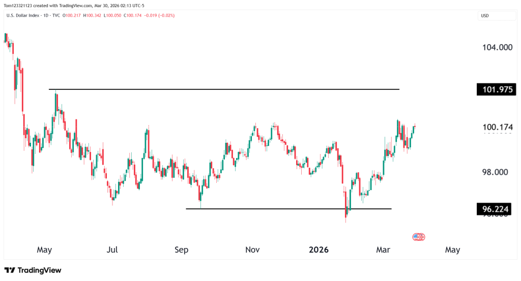 Overall, the structure is still neutral, but the short-term trend has shifted higher. The move from 96 to 100+ has been relatively clean, with higher lows forming along the way.