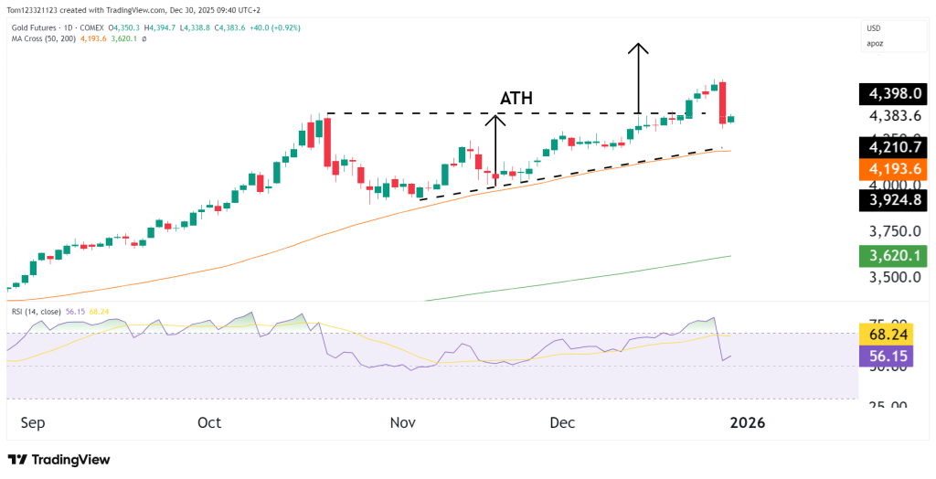 On the daily chart, gold remains above its rising 50-day moving average, which continues to act as dynamic support. The market has printed a series of higher highs and higher lows, confirming that the dominant trend remains bullish. Recent pullbacks have been shallow and corrective.