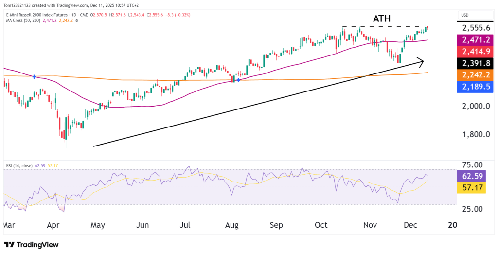 In the previous RTY analysis (2 December 2025), we highlighted that the Russell 2000 was attempting a recovery after rebounding from the 2,300–2,320 support area, with bulls aiming to retest the all-time high (ATH). Since then, RTY has continued to build on its momentum, with price rallying 11% from the lows made on the 21st of November. The ATH was tested and broken on the December 10 session, so the next few sessions will be important to see if the buying power is strong enough to continue with the momentum or if the resistance will be too strong.