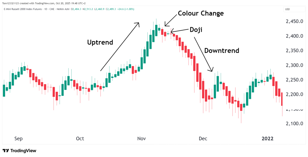 Heikin Ashi candles also make it easier to notice when a trend might be running out of steam.
